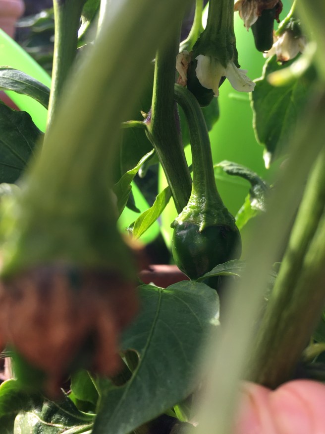 It’s growing in the dead center of the plant- which is damn inconvenient, but plants gonna plant. I’m just glad that even though the two hatch plants are in a less than optimal container, they seem to be doing ok. Well at least this one is, his friend next door isn’t doing much. So far that’s 2/6 pepper plants showing baby peppers.