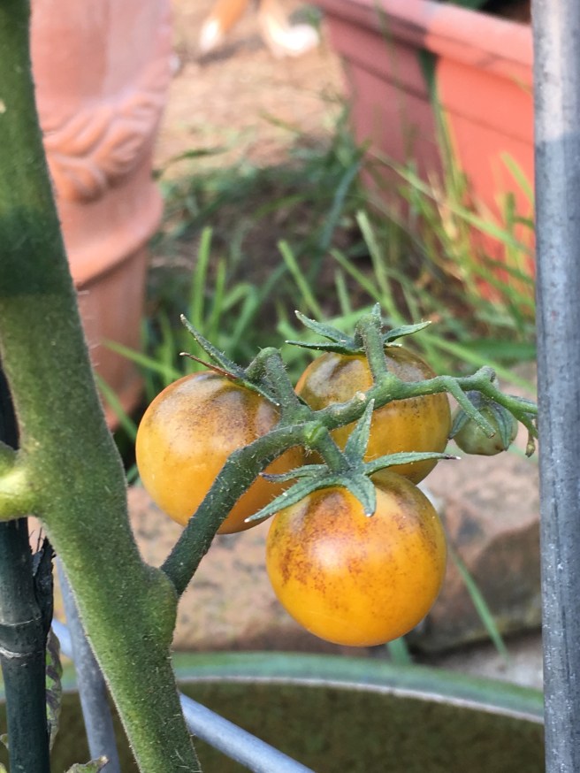 It’s heat more than sun that ripens tomatoes- so even with the gloom as long as the temperature continues to stay warm-ish, the new growth and a more cautious watering schedule means that I might get more than these 3 tomatoes.