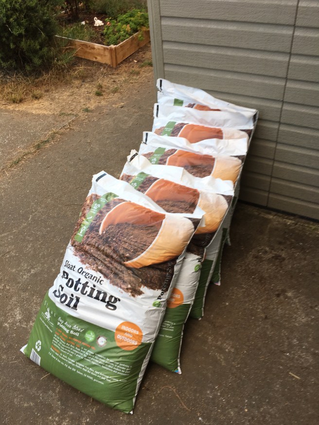 Ta-da! Pictured: what looks like overkill but actually isn’t. See the yet to arrive carrot bed will hold around three bags and I need to take the top layer of bean debris off the top of the double bed which means another bag split between them- AND there is the two empty and waiting pots that I’m going to… well do something with and they’ll need soil too. So yeah, this gives me enough soil within a reasonable margin or error.