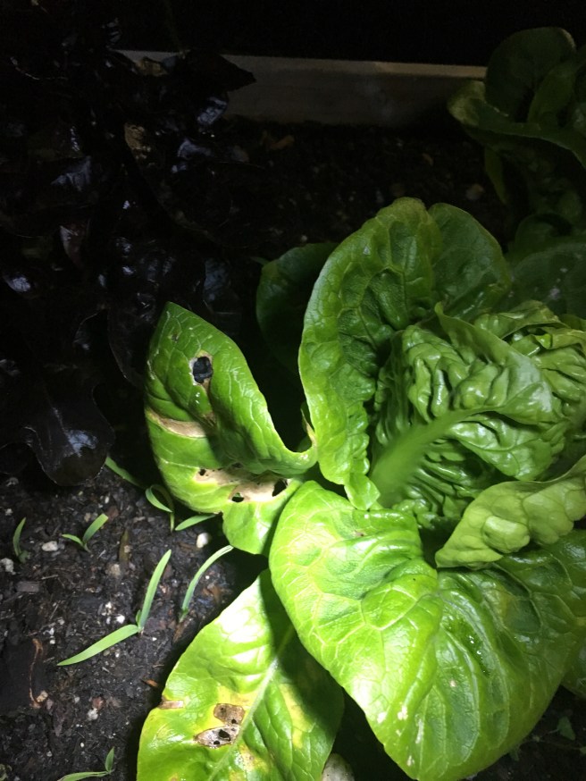 The outer leaves of my romaine lettuce are getting nibbled, but between the slug bait and careful attention the inner leaves are fine. I think until the plants are taller I’m not going to pluck the outer leaves- this way the bugs will eat the outer leaves first.