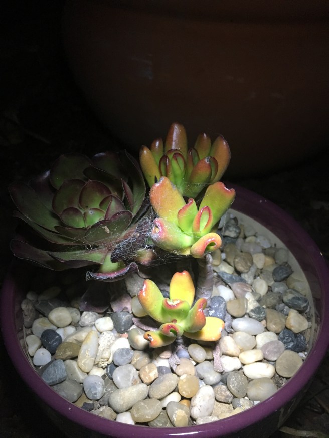 There’s a spider that lives in these succulents. I sometimes clean up the webs but it always comes back. Can’t help but be fond of the dang thing.