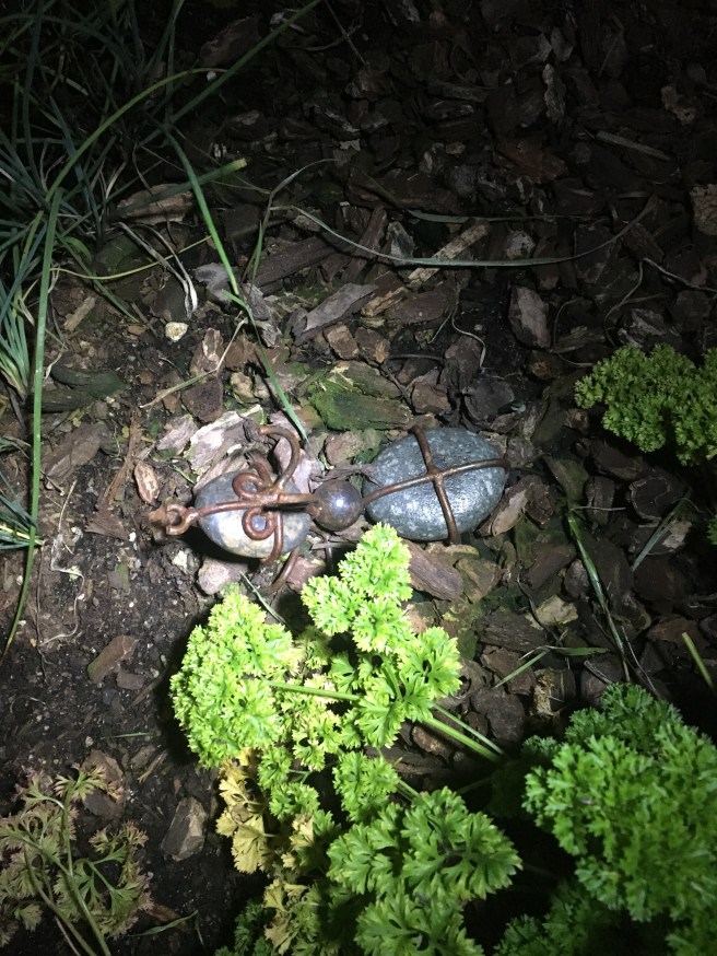 I got this silly metal and stone ant in Petaluma. It lives among my herbs.