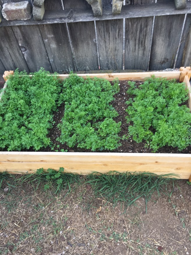 Tomorrow when the weather isn’t quite so melting for a delicate hominid as myself, I have a few tasks. Chief among them is to thin the carrots. As you can see they’re really bushy- they’ve grown really quickly, proving everything I’ve read about growing carrots from seed is incorrect and it is in fact quite easy- if you do things correctly.