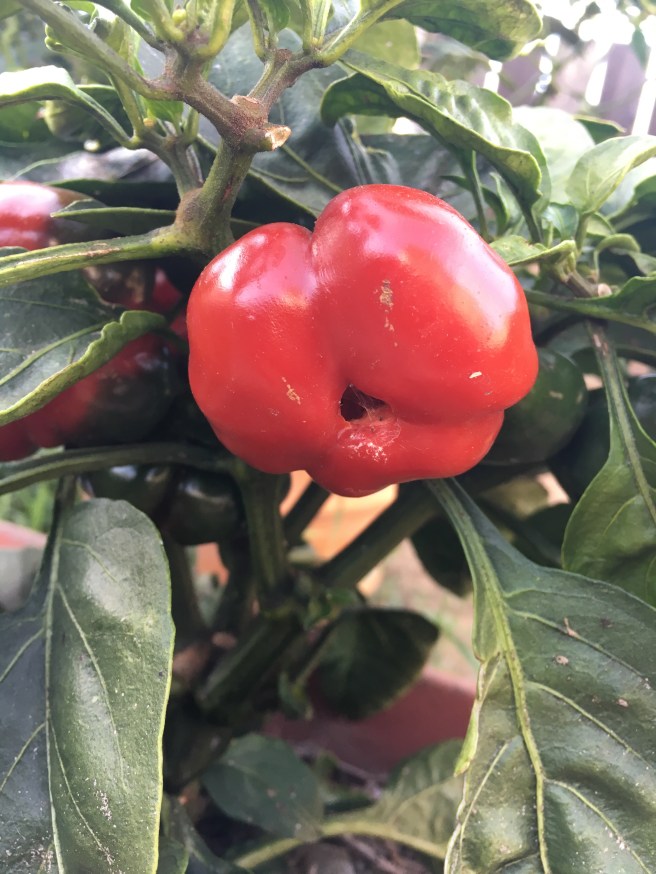 We had a pepper casualty. I was so happy! An all red baby bell pepper ready for harvest! And then I spotted the hole in the bottom… and something moving inside.