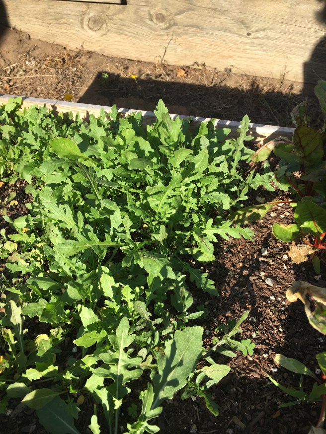 While the Swiss chard is also heat damaged- I’ll have to re-sow a few of those- the arugula is just booming. Arugula is almost like a weed- there is no arugula season, as long as the sun is shining and there’s no ice on the ground, it’s arugula season! It’s become my garden snack, if I’m watering in the back- I’m eating some arugula. not sure I’ll have enough for the table- it’s all going in my mouth!