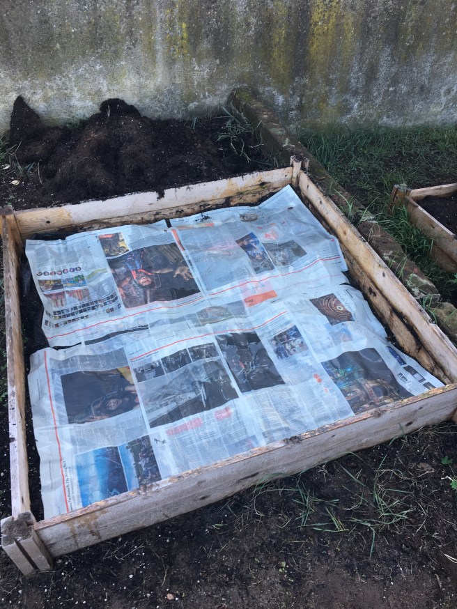 Did the newspaper trick after clearing the old moldy fava bean dirt and the few weeds that had taken root.