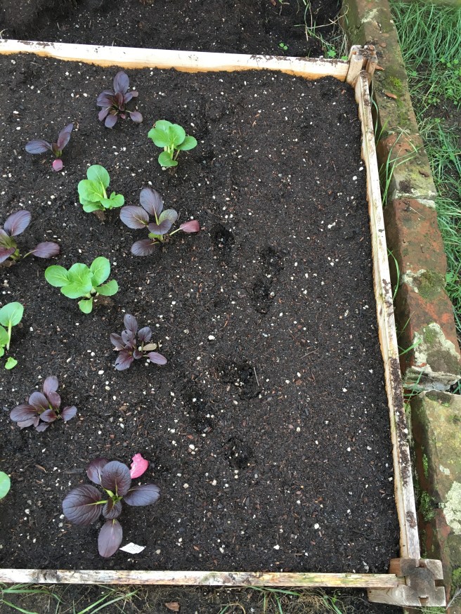 There has been a criminal in the 4×4 bed! Probably a cat. Always the problem with a low newly sowed raised bed- the local cat population just thinks “yay, new litter box!” Luckily there wasn’t any poop to be seen just the footsteps (and probably urine) of a local ruffian.