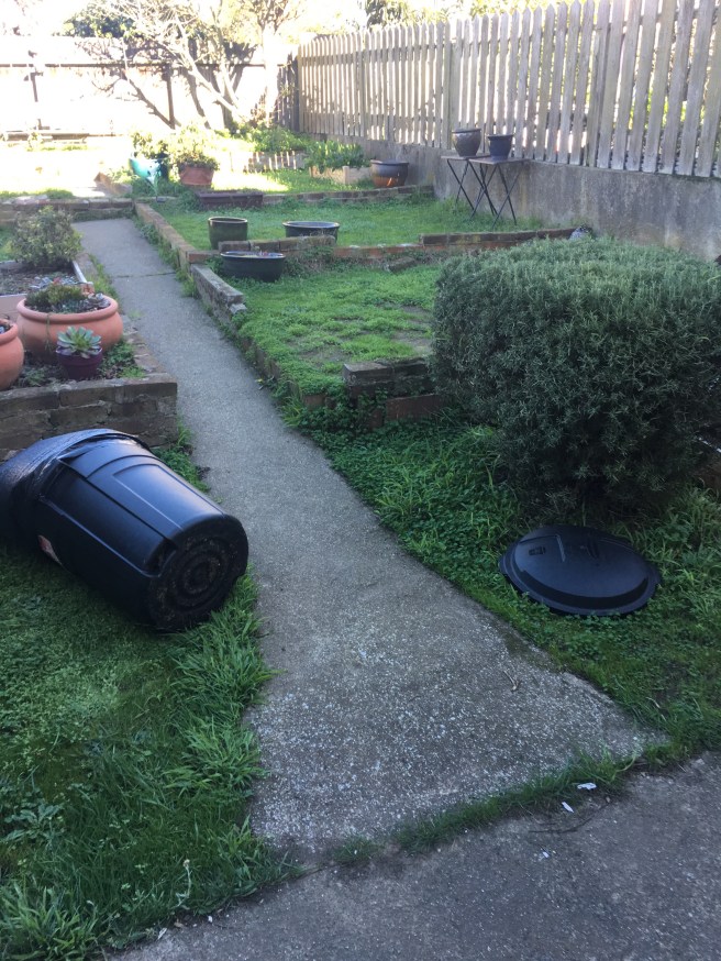 The back trash can got blown about 20 feet away from where it’s supposed to be, and separated itself from it’s lid.