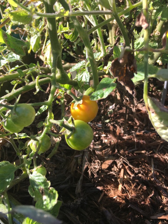 I was slightly worried my Gerry-rigged tomato setup would get blown over, but it’s hanging in there, and the little tomatoes are continuing to ripen.