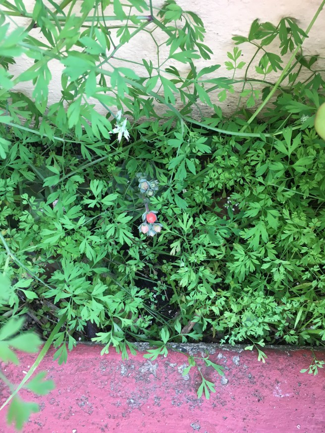 Of course- that’s also where weeds come in. As you can see from my poorly lit photo- the recent spate of rains has not spared my little tiny strip of dirt from a massive overgrowth of weeds.