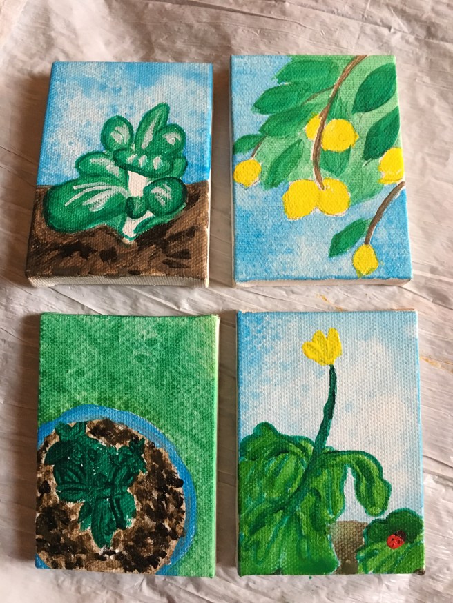 The lemon tree is probably my favorite- drawing arugula is hard! But it’s nice to experiment with so much green, and it’s nice to have paint stains on my hands again.