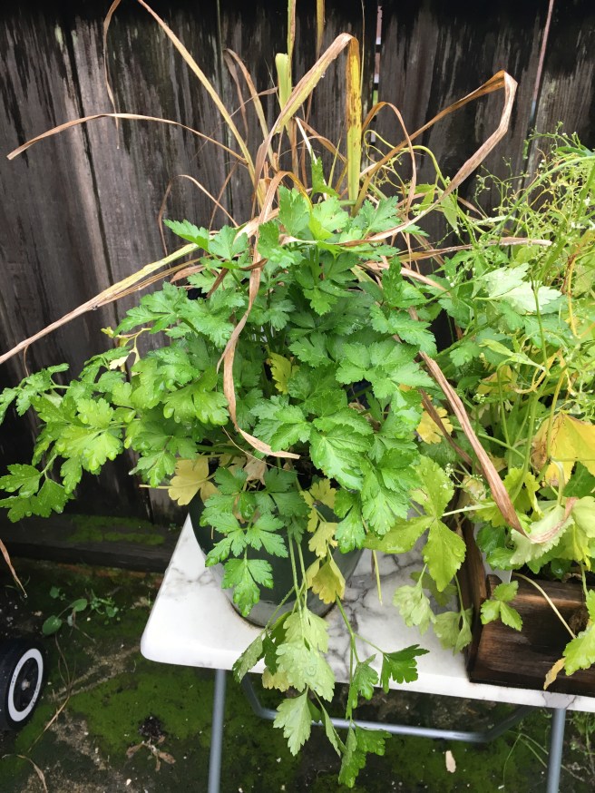 Even the hardy parsley looks a little wilted. Luckily fixing a parsley plant on the fritz is pretty easy- light fertilize, cut away the yellow leaves, harvest the good leaves so new growth can form. Not sure how to do that with the lemon grass.