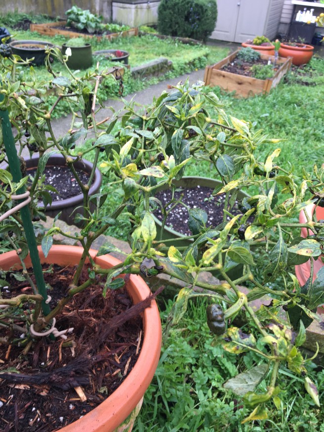 The poor pepper plant looks positively pathetic. What it needs is some sun and time to dry out- what it’s getting is a deluge. The wind keeps knocking it out of its ties, so I keep having to go out and re-tie it. I was really hoping my pepper would last til summer and start growing again, but I’ll be surprised if it survives the month.