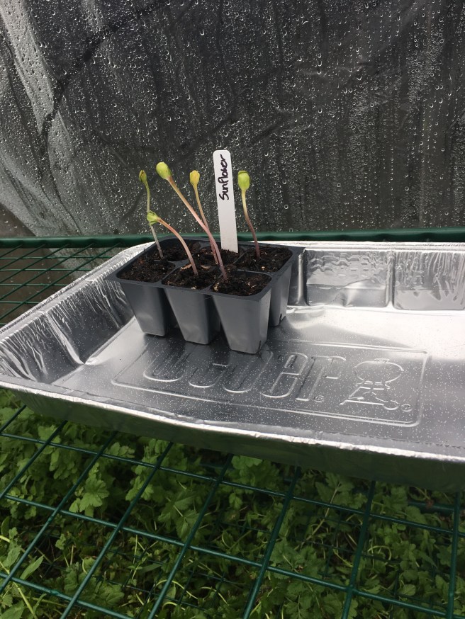 The sunflowers are already in the sun box which is the only dry place in the garden. It’s warm in there so maybe that 6th seed will start- but as 5/6 isn’t bad, I’m not too worried.