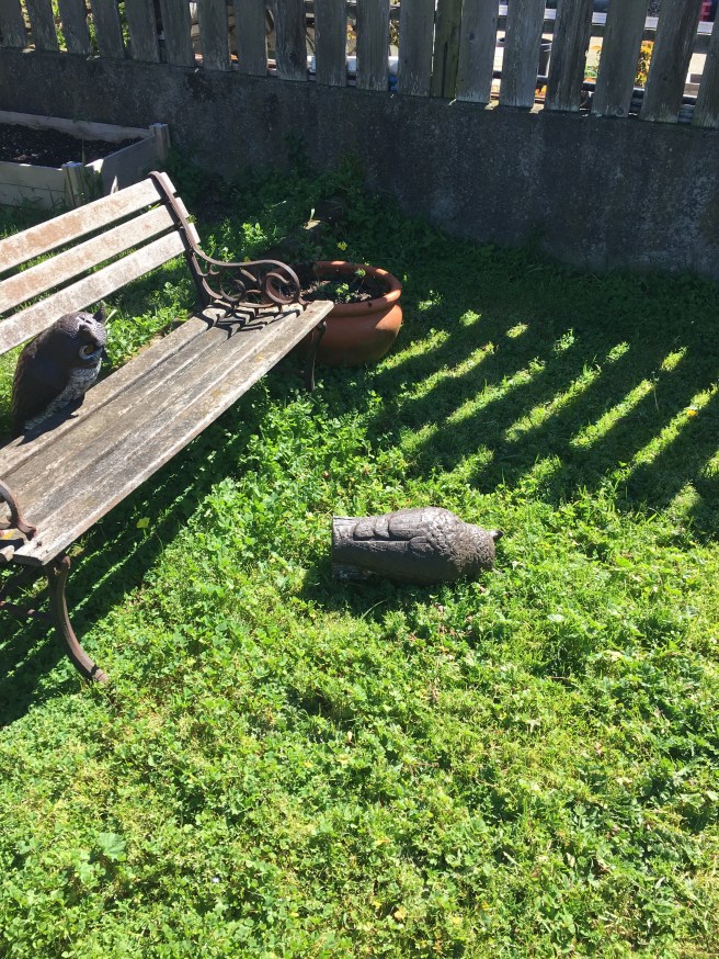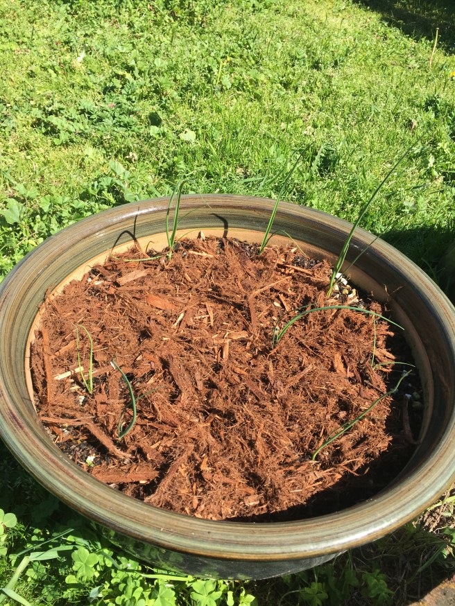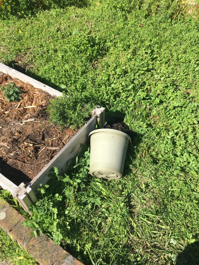 Ha ha oops. There goes the garlic chives! My fault for using that old plastic pot I guess- I had gambled that the weight of the soil would be enough but apparently it was not!