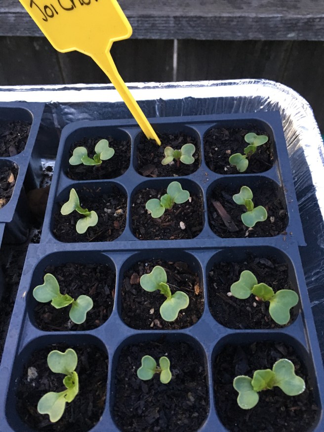 The Joi Choi are colorful too- crisp white stalks and lush green leaves. Of course it’s going to be interesting finding room for all of them- I was expecting a few dud seeds when I sowed 12… there were no dud seeds…