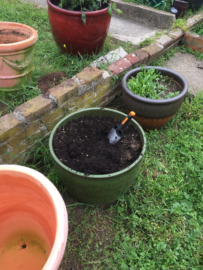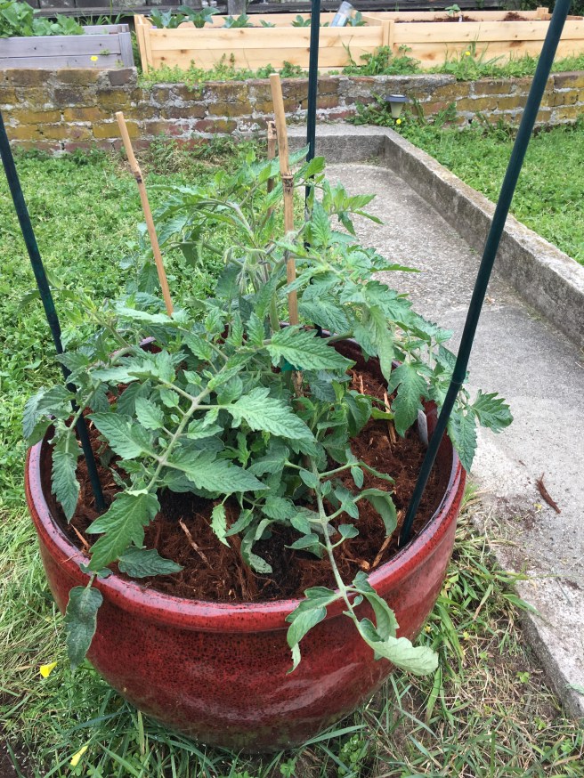 The sweet 100 went into my new extra large terra-cotta pot, along with granular fertilizer, sure start and lots of potting soil. I think the old tomato cages will do for this one- on Wednesday when the rain breaks I’ll assess my options.