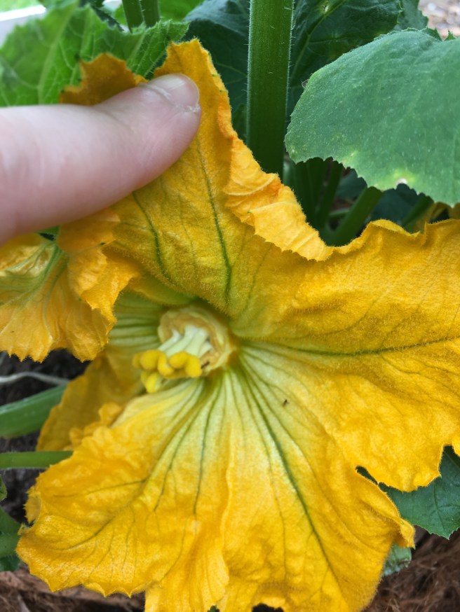 Of course the way the aphids are climbing the bench to get to the seedling are ants. Here’s a few on my first really spectacular squash blossom. I had to cut back some of the moldy leaves on the squash monster and mulch heavily but it seems to be taking well.