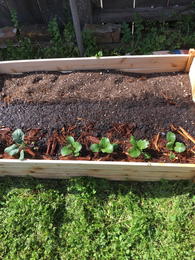 I also sowed what was left of the chard packet behind the upper Bok Choy and romanesco. Eventually the very back of that bed will also have green beans. In order to get a staggered harvest of beans I’m waiting to sow until the other plants are bigger.