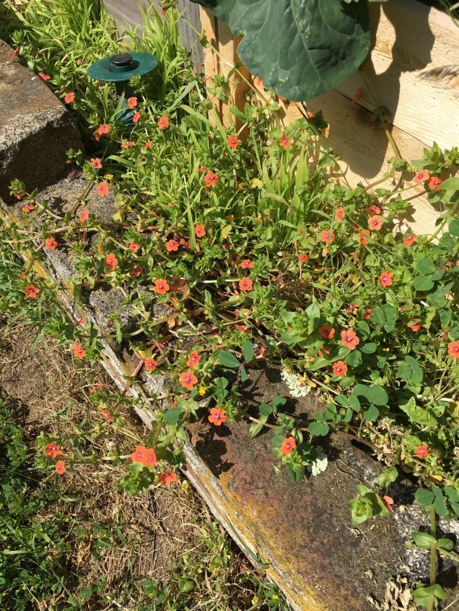 1. What a cool bee hotel. Re your scarlet pimpernel; a client of mine is an organic garlic grower, a very difficult thing to crop commercially without herbicides. He mentioned being interested in living mulches – something invasive without harming the crop to suppress other weeds;but not too weedy; that doesn’t take too much water; and that allows safely working with bare hands. He’s considering chickweed (Stellaria media) and I’m also suggesting scarlet pimpernel (Anagallis arvensis). White mustard is another possible – anything to save time in the garden and reduce weeds.