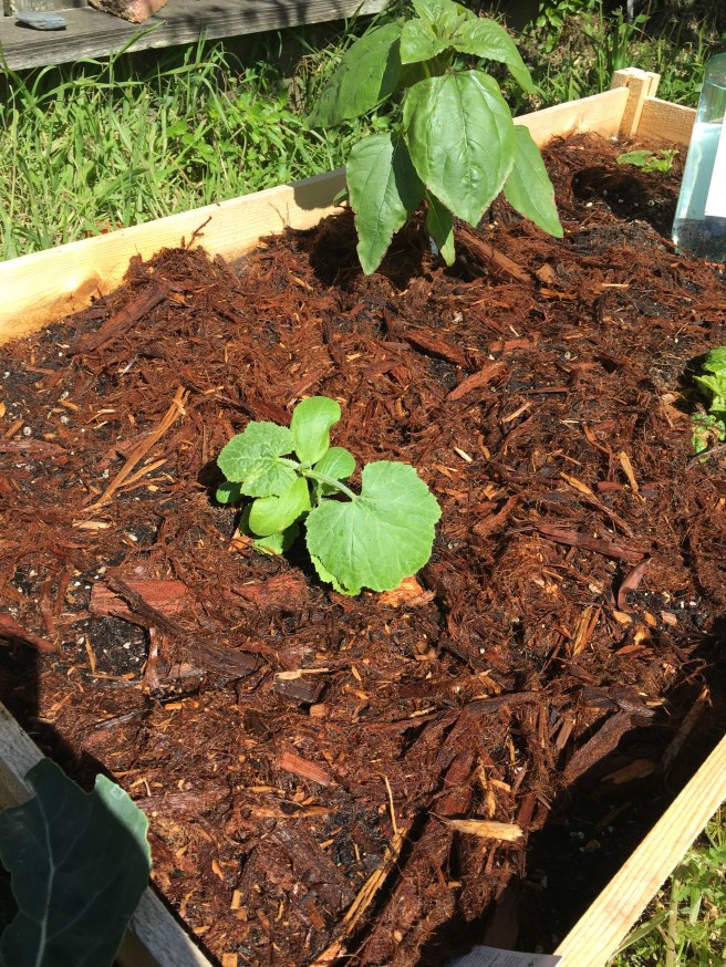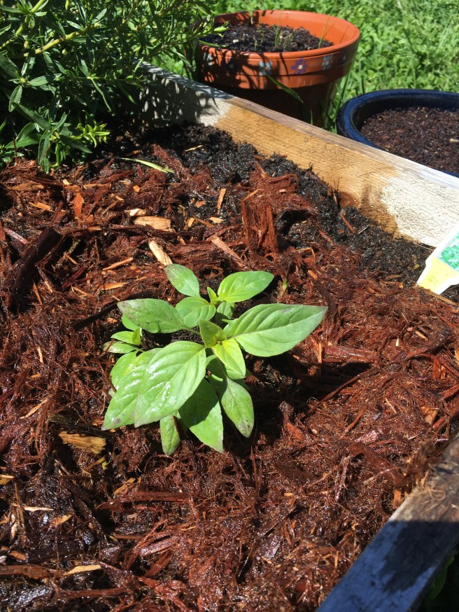 I have completely given up on Italian basil, and if I were to un-give up on it, it would go into a pot. They didn’t have any blue bush basil which is a shame, but they had some very healthy looking Thai basil. Slightly different flavor, but a heartier plant, which as you can see I’ve mulched the absolute heck out of. It’s still a crazy gamble, but it’s been so sunny… well, all gardening is a gamble really.