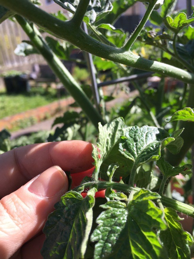 So I placed my biological weapon at the base of the tomato plant, and now I wait. The sun gold has a thick healthy stem and very bushy leaves, so I’m optimistic that it will be fine during the aphid onslaught.