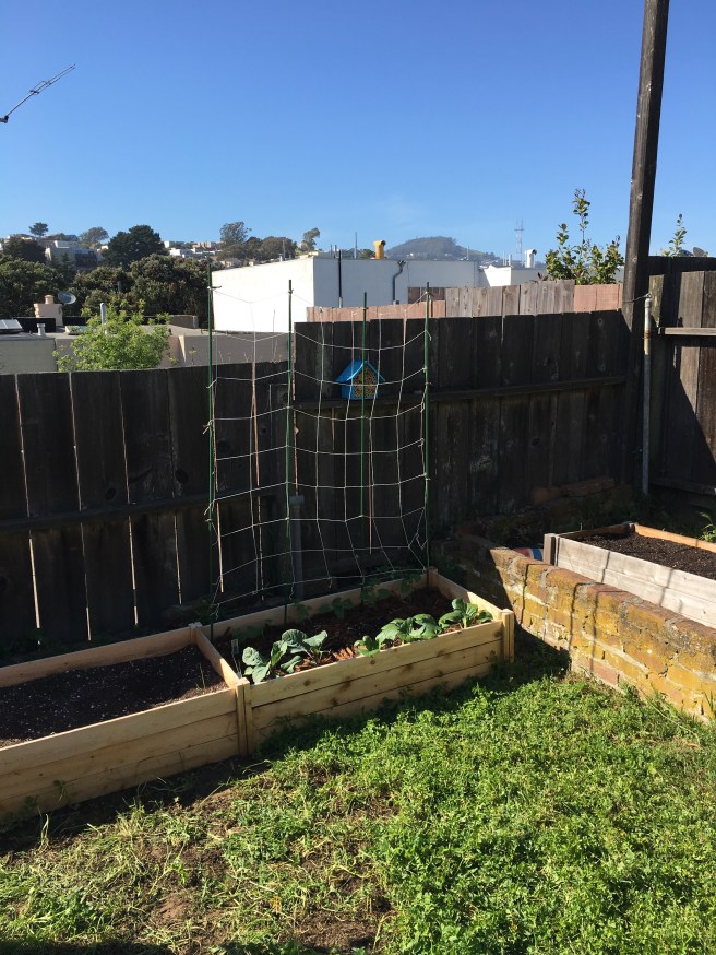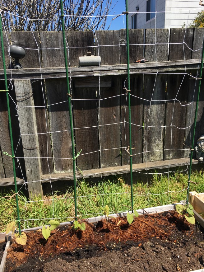 I used soft ties to anchor the netting to 4 of the really tall stakes. These are the trionfo violetto beans, and they’re growing fairly well. The turnips in front of them might be gone, now replaced with the last of the romanesco seedlings but at least the trellis is up.