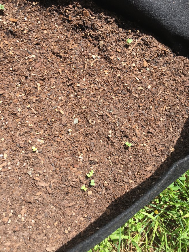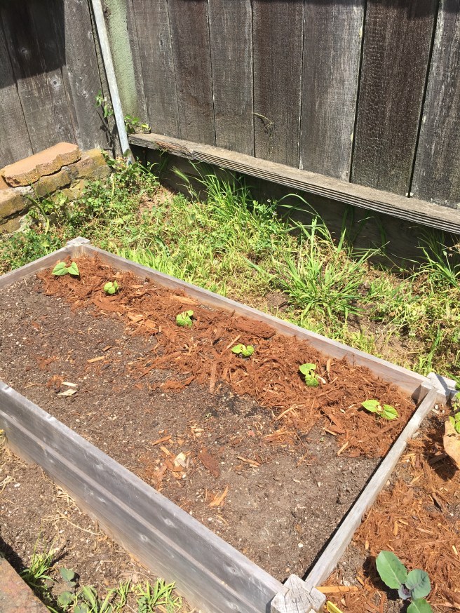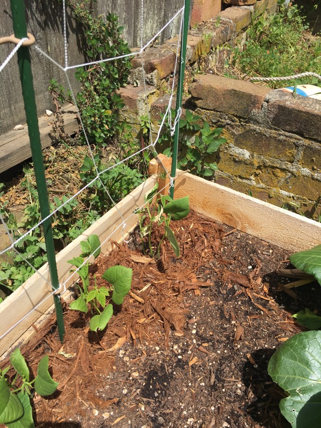 The beans sowed from seed in the back- Kentucky Wonders- are growing nice. They’re mulched and one or two of the Swiss chard seeds have sprouted in front, but they’re too small to mulch. Swiss chard can get huge when planted with beans, due to the nitrogen fixing so fingers crossed. In a week I’ll put up the trellis for these guys- have to check to see if I have enough stakes of the proper size though.