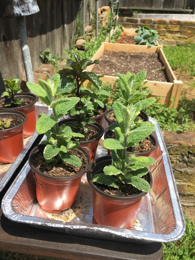 As you can see they’re quite vigorous. I’m also attempting to grow some thyme from cuttings, jury’s out on that one. Cuttings are a crapshoot- like 60% just don’t take. But with a little surestart and some love some will- and then you can multiply your plants. This is especially useful in plants like mint and thyme which can be used as borders or ground cover- expensive to buy all the plants you need to cover such a space- much cheaper to take care of a few vigorous specimens and over the course of a few months take cutting after cutting until you have enough for your needs.