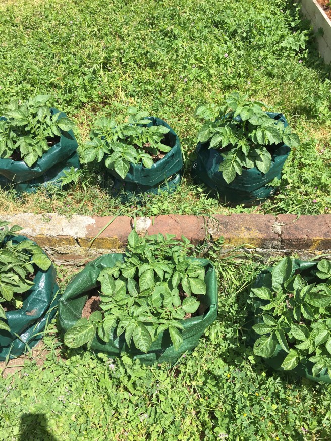 Luckily my younger potatoes are growing great- it’s gonna be time to put extra soil in those bags soon. This might be the crucial difference between proper seed potato and just chucking supermarket potatoes in a bag though. It could be the sulfur dip I put on my supermarket potatoes wasn’t enough and that’s why it’s acting up. We’ll see anyways.