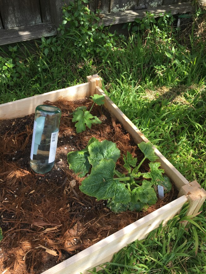 And of course there’s my other zucchini plants in the back which are growing well when the feral cats aren’t sitting on them. I suspect they’ll be too spiky for cat butts soon anyways.