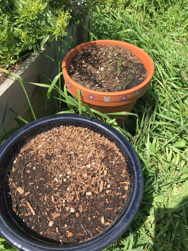 1. The front dark pot is ceramic and has garlic chive seeds while the back terra-cotta pot is regular chives coming up as expected. I don’t generally use plastic pots though I think there might be one kicking around with cilantro in it. As of today one garlic chive came up- so maybe garlic chives just take longer to germinate than regular chives.