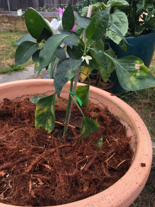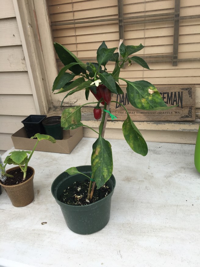 I cut off the red peppers for eating, and buried the newcomer up to its neck. Proper pepper planting protocol.