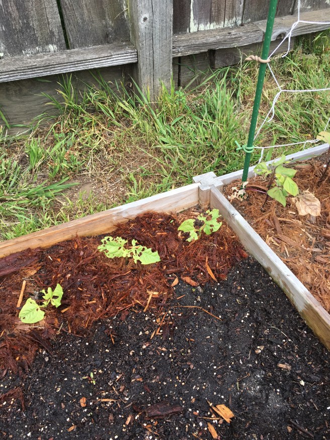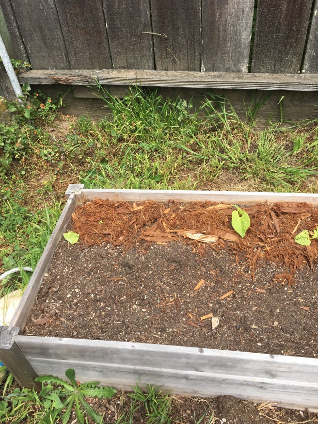 Here’s an incredibly annoying thing- the bare spot in this bed is where two bean sprouts once were. It looks like some creature just straight up ate the tops of two of my beans. Just- *monch* no more beans.