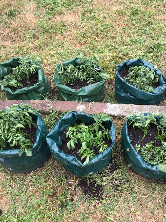 The baby potatoes in bags are growing vigorously enough that it was time to put more dirt in the bags. I still don’t know what the hell is going on with the two older potatoes, and I suspect tomorrow I’ll be digging up one of the bags to make sure this isn’t a blight situation.
