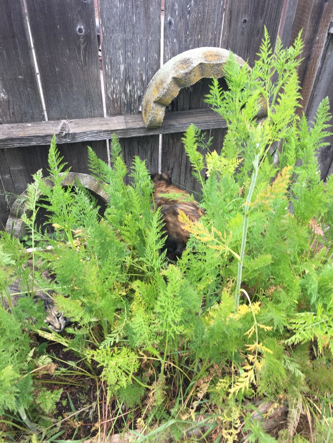Another thing I can do nothing about is the criminals. The entire time I was working in the garden I had the peculiar feeling of being watched. Well I *was* being watched by a pair of criminals who were lounging in the carrot bed and spying on me for hours. Here is a quick pic of criminal tortoiseshell fleeing while criminal grey tabby stares at me through the carrot tops.