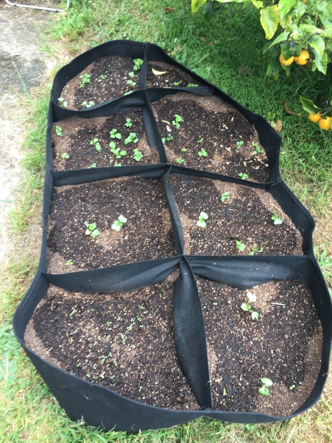 Oh god bless the radish. And all the other brassicas, lettuce and arugula in the large fabric bed. Everything is coming up really nice and it doesn’t need too much water.