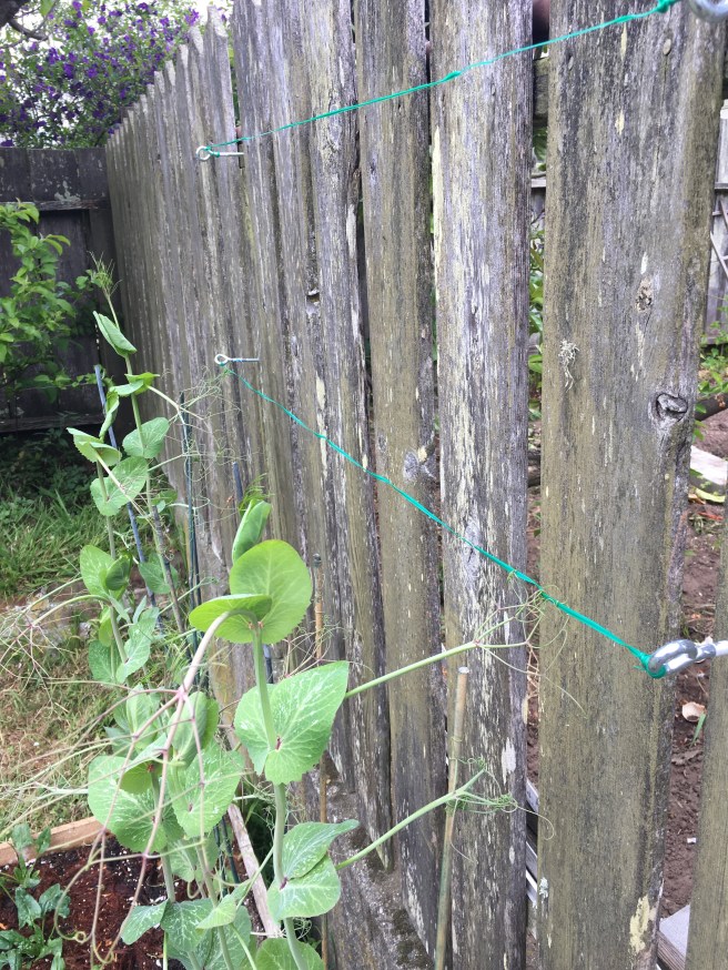 Here’s some fun. The purple peas have so outpaced their dinky stakes I screwed some eyelets into the fence and strung wire between them.