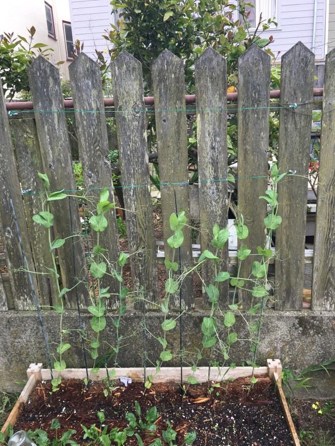I hope my neighbor likes peas because I think there’s no way I can stop this plant from going right over the fence. The spinach in front is questionable of course, I’m concerned after the heat wave last month it might go straight to seed- but there’s nothing I can do about that.