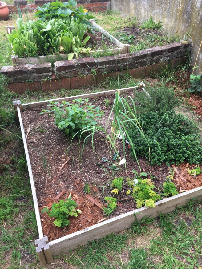 Here’s a previous shot of the shadier herb bed. As you can see the thyme is heavily overgrown. First task was cutting it back, along with the lemon balm, and weeding as best as I could.