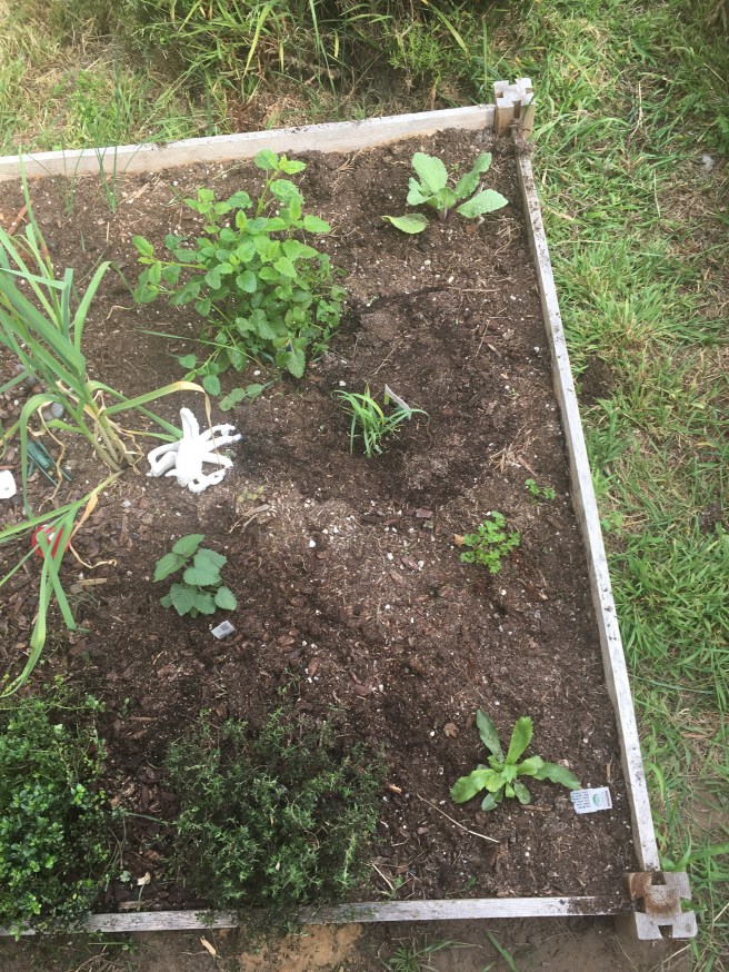 I have a few interesting survivors in this bed, some chives that refused to die, a lone parsley seedling that sprouted when all the others wouldn’t, and a shiso that refused to die.