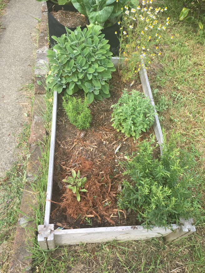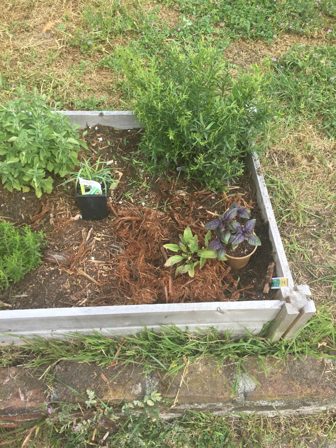 I put the purple basil next to the Thai basil, and the lemon grass next to the oregano. Yes I have two lemongrasses. I like the taste, but it also has a way of repelling pests (not unlike the borage) and I hope by having one in each bed I can have less pest problems as it gets warmer.