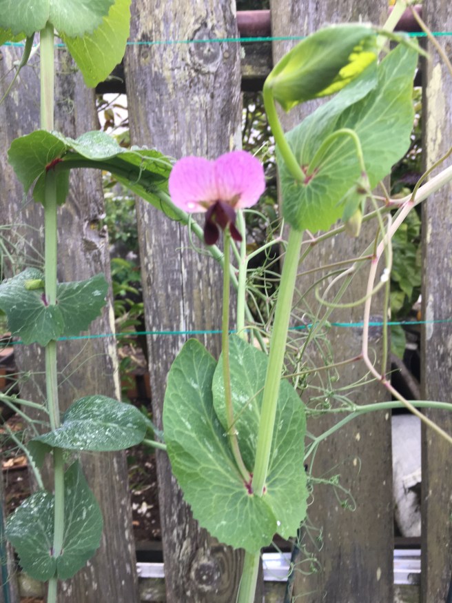 The purple peas are vigorously trying to scale my neighbor’s fence, and they’re putting out gorgeous flowers.