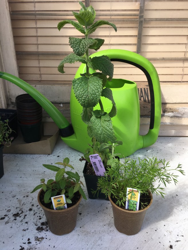 I got more herbs then thyme however- a lemon verbena, a really fancy cilantro, and a lonely apple mint that I’ve seen languishing on the herb table at work for longer than I’ve actually been working there- getting bigger and bigger while nobody bought it.