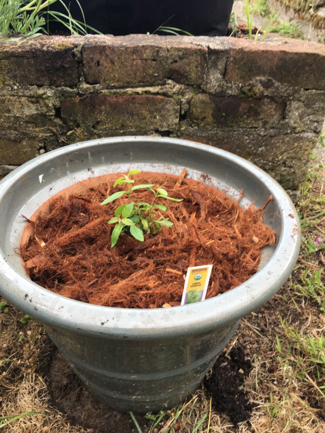 Lemon verbena is actually a small shrub or tree. Or it will be. That’s why I put it in a larger pot. It’s deciduous like an oak tree- and will be bare twigs in winter- but it will come back into lemon scented magnificence in spring.