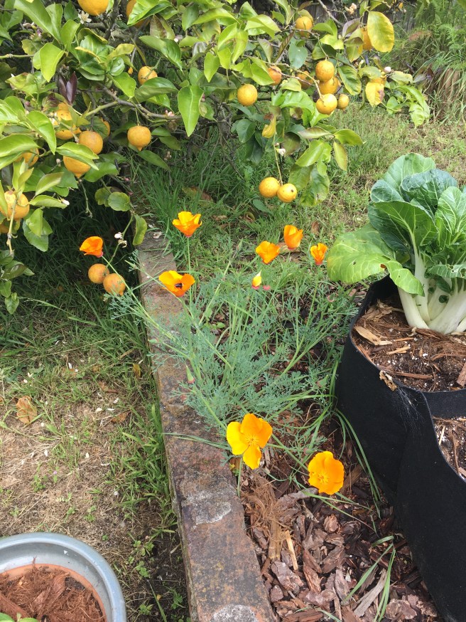 I’ll leave you all with the poppy the birds sowed this year- blooming away with a bee in one of its flowers.