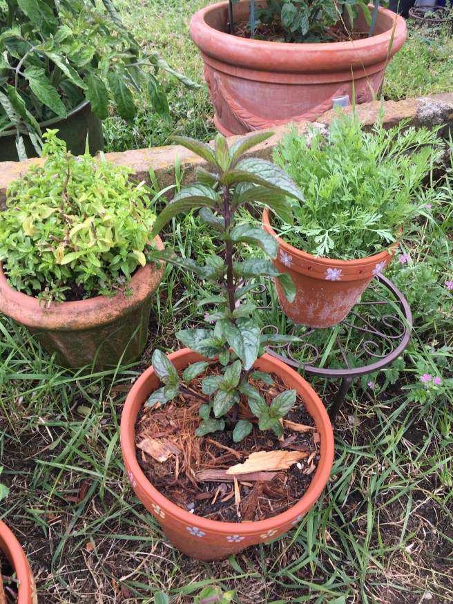 Soon they’ll be trying to take over the herb bed too. The other herbs I put in are doing well thanks to the wacko May downpour we’ve suddenly got.