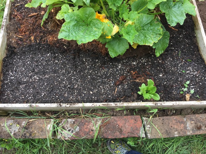 So this is where the romaine was. There’s one left as you can see- but the rest were eaten either eaten or pulled as icky. In its place I sowed some extra big radishes. Crimson giants to be precise. They’ll grow quick enough so that in a month I can put something else there- maybe some more green or bunching onions.