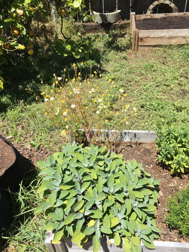 That sage is super overgrown. And the chamomile is no longer viable. Well for me anyways. I had a few cups of chamomile tea from this plant. They were delicious. And I got super sick. Turns out chamomile doesn’t agree with me.