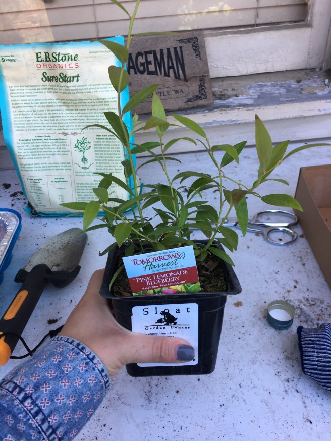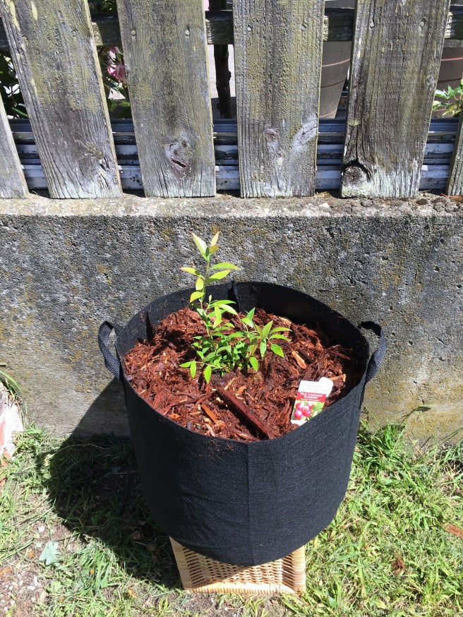 To grow any kind of berry you need acidic soil, so I chucked a bag of azalea mix into a 10 gallon fabric pot and potted it up all pretty.